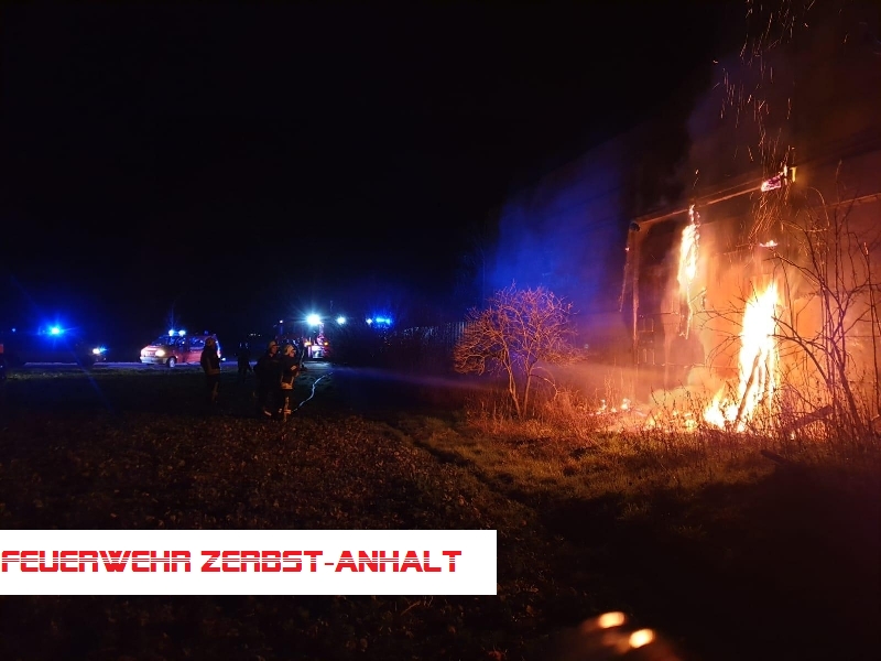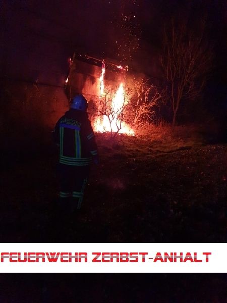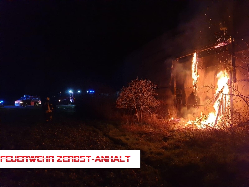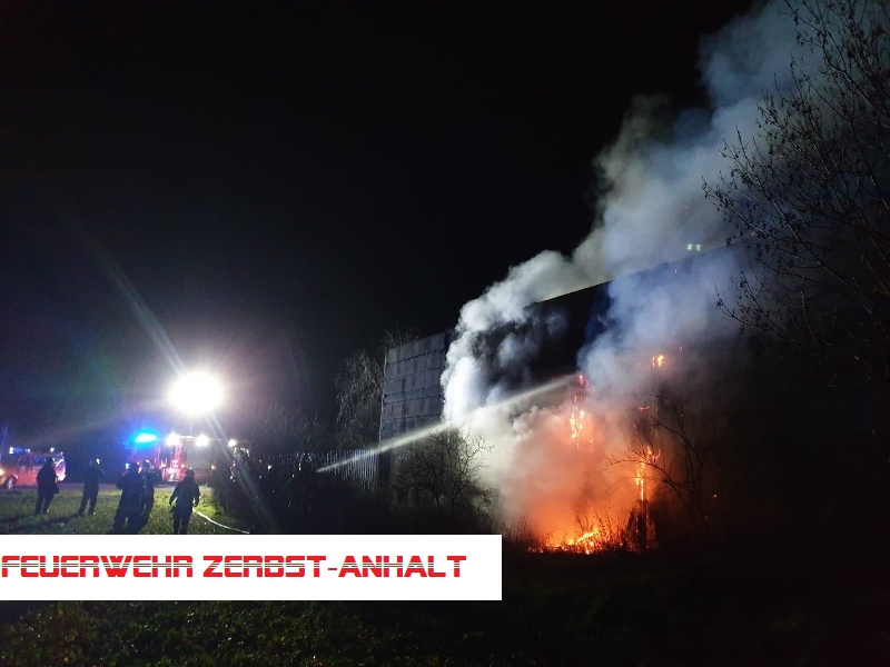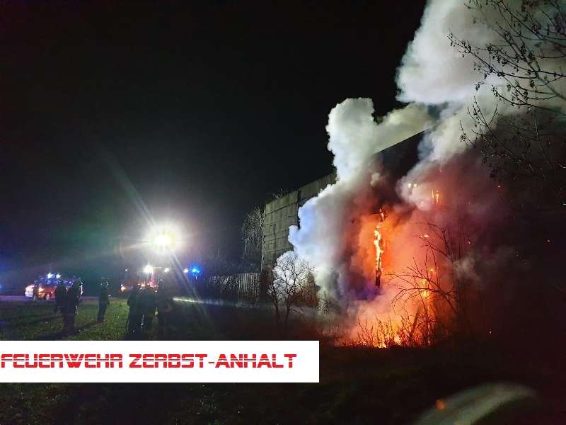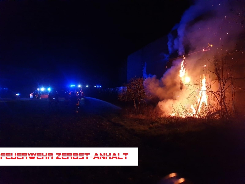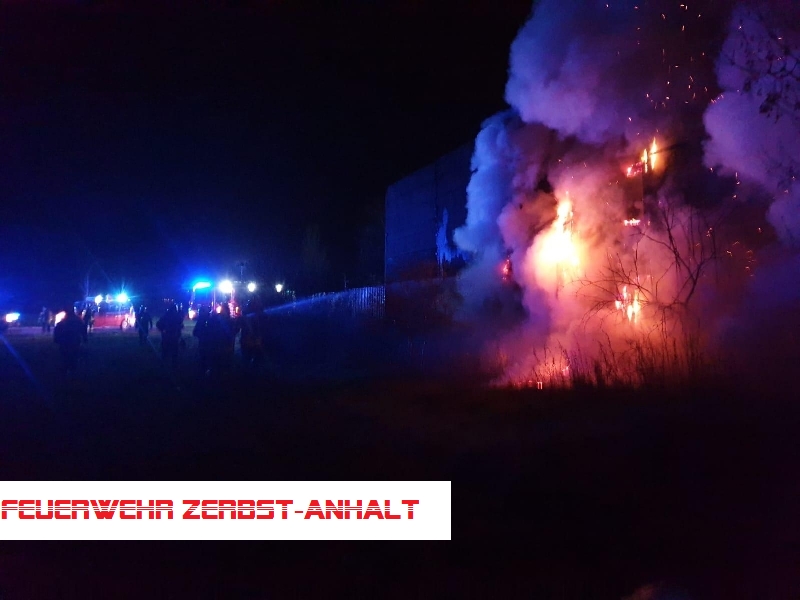 Der zweite Einsatz des heutigen Tages führte uns in Richtung Tochheim. Hier brannte am Ortsausgang von Zerbst das Tor einer Lagerhalle, das Feuer drohte, auf die gesamte Halle überzugreifen.