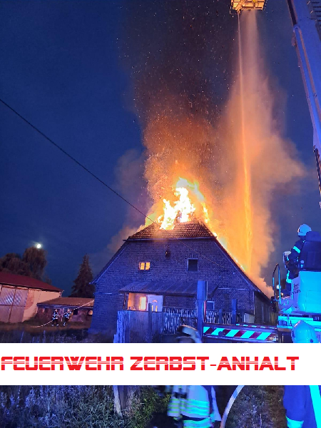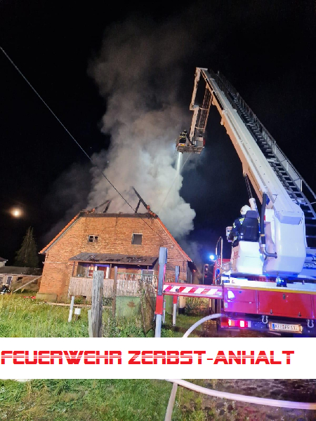 Parallel wurde ein erster Löschangriff mit dem Wasser von zwei Löschfahrzeugen (TLF Güterglück und HLF Hohenlepte) vorgetragen. Unsere Aufgabe bestand darin, auf der Straßenseite des Gebäudes eine Riegelstellung zum bisher noch nicht betroffenen Gebäudeteil aufzubauen und vom Hubsteiger aus einen Löschangriff auf den brennenden Dachstuhl vorzutragen. Hierzu musste zunächst durch weitere Kräfte eine etwa 400 Meter lange Schlauchleitung zu einem Löschteich aufgebaut werden. Später unterstützte uns beim Löschen des Dachstuhls die Drehleiter der Freiwilligen Feuerwehr Aken.