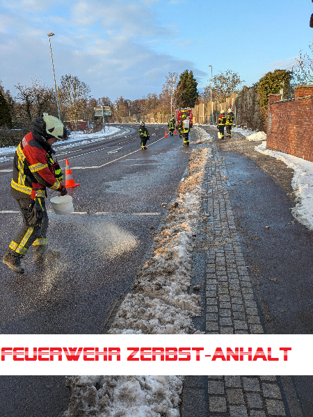 Wir wurden wegen einer Dieselspur auf der B 184 alarmiert. Auf der Roßlauer Straße direkt vor der Kreuzung Marcellstraße fanden wir eine größere Dieselpfütze vor. Durchfahrende Fahrzeuge hatten den Diesel bereits im Kreuzungsbereich und über etwa 100 Meter auf der Fahrbahn verteilt.