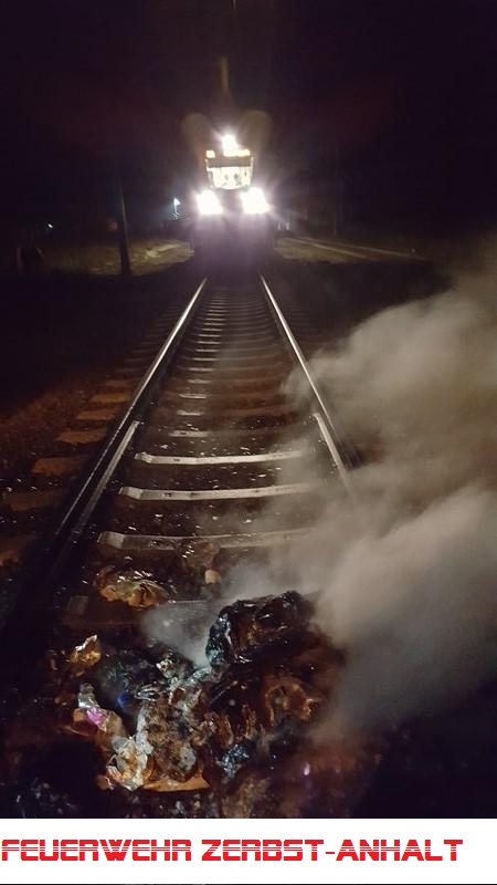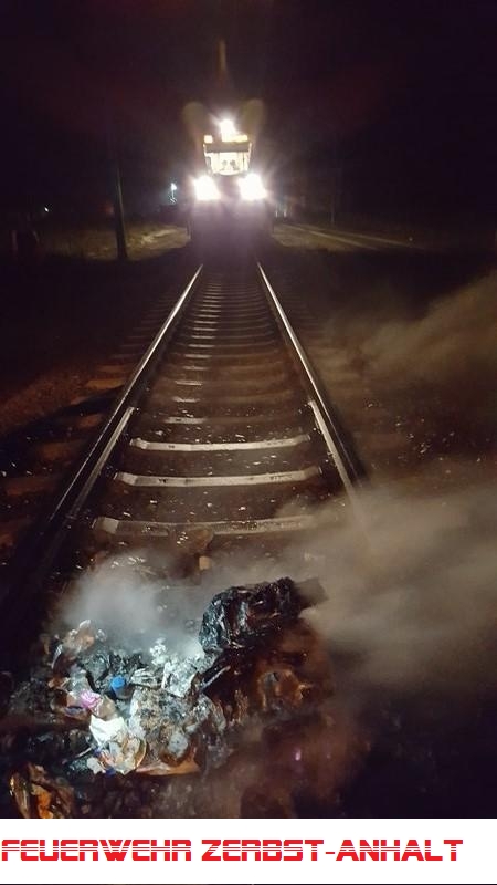 Mitten auf dem Gleisbett vor der Einfahrt in den Bahnhof aus Richtung MD brannte eine blaue Papiermültonne in voller Ausdehnung. Unmittelbar davor stand der Zug 16145 (Regionalbahn).