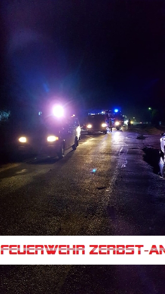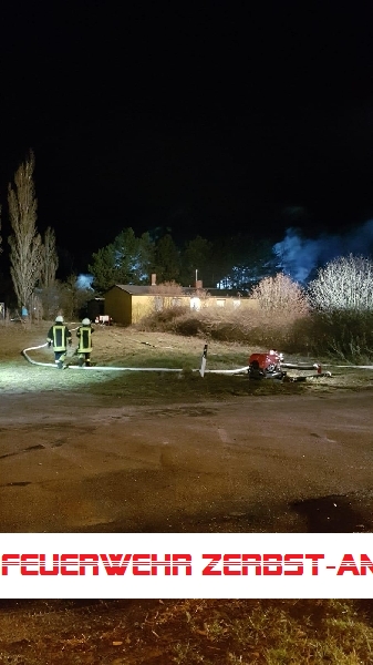 Wir wurden gemeinsam mit der Freiwilligen Feuerwehr Jütrichau zu einem Brand in einer ehemaligen Stallanlage gerufen. Vor Ort stellten wir eine brennende Baracke fest. Während des Aufbaus des Löschangriffs wurde bei der weiteren Lageerkundung auf dem unwegsamen Gelände festgestellt, dass es in einer weiteren Baracke etwa 200 Meter entfernt ebenfalls brennt. Während die Freiwillige Feuerwehr Jütrichau den zuerst festgestellten Brand bekämpfte und hierzu eine Wasserversorung von einem nahegelegenen Brunnen aufbaute, übernahmen wir die Bekämpfung des zweiten Feuers. Hier wurde ein Pendelverkehr mit dem Tanklöschfahrzeug eingerichtet.