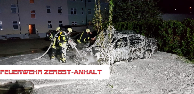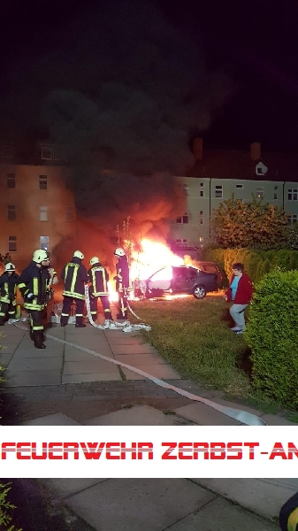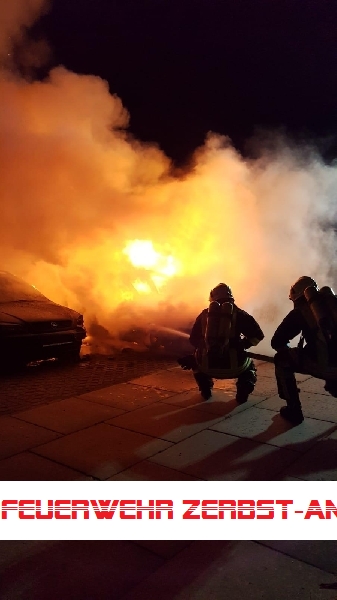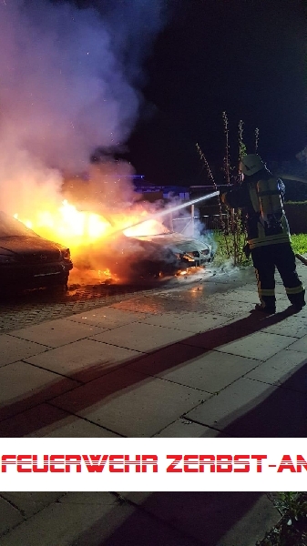 Wir wurden zu einem PKW-Brand in die Bahnhofstraße gerufen. Dort brannte auf einem Hinterhof ein PKW, das Feuer griff auf einen ein weiteren PKW über.