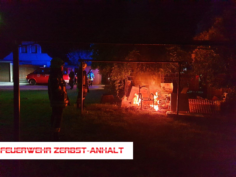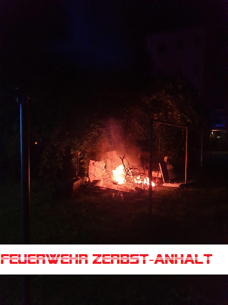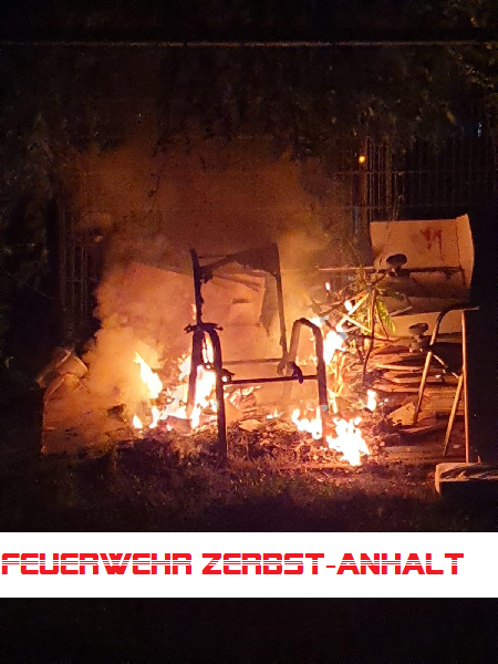 Wir wurden wegen eines starken Feuerscheins an einem Mülltonnenstellplatz in der Fuhrstraße alarmiert. Dort brannte tatsächlich ein Sperrmüllhaufen.