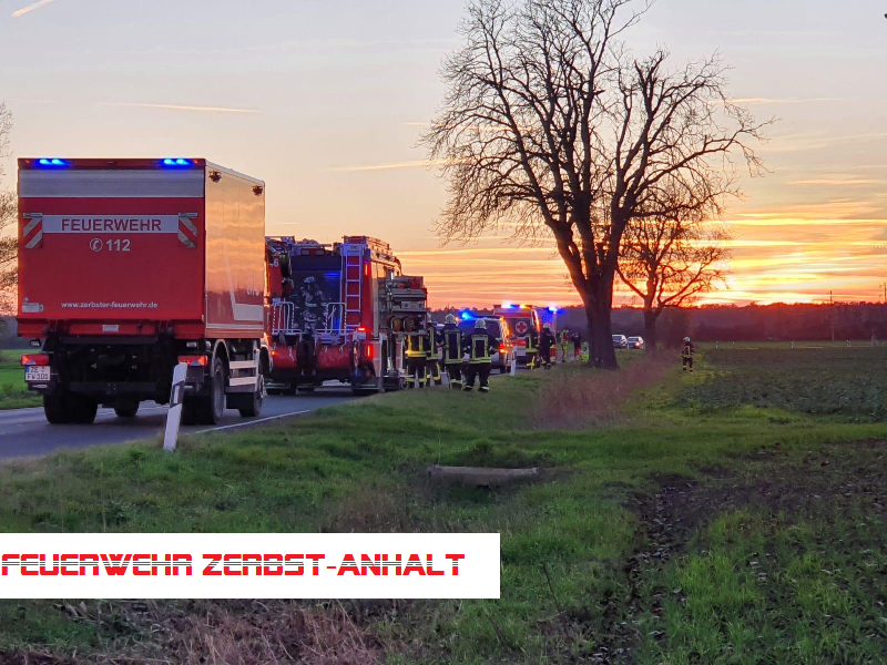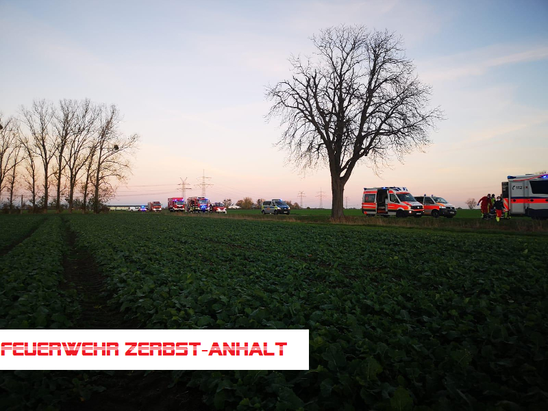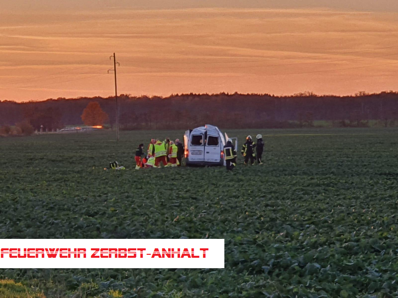 Wir wurden mit dem Stichwort "eingeklemmte Person" zu einem Verkehrsunfall zwischen Zerbst und Tochheim alarmiert. Dort hatte sich ein Transporter vermutlich mehrfach überschlagen und war auf einem angrenzenden Feld zum Stehen gekommen.