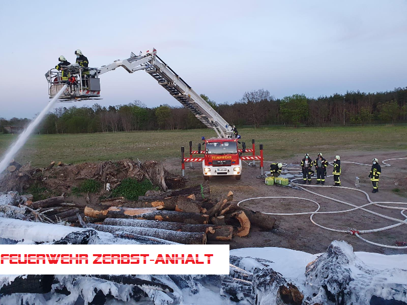 Unweit der Einsatzstelle vom 27.04. brannte erneut ein größerer Haufen gelagerter Baumstämme. Das Feuer wurde zunächst mit 2 C-Strahlrohren bekämpft. Nachdem eine stabile Wasserversorgung zu einem in der Nähe befindlichen Hydranten aufgebaut war, erfolgte die Brandbekämpfung zusätzlich mit dem Monitor des Hubsteigers.