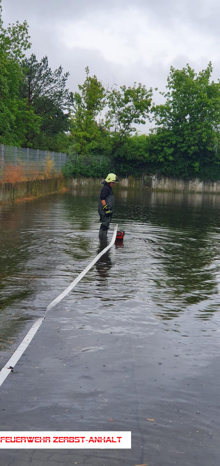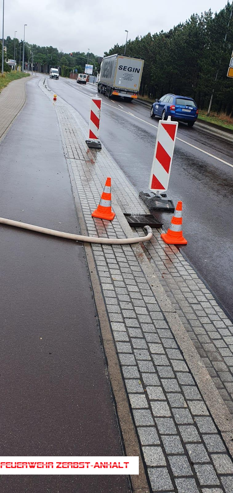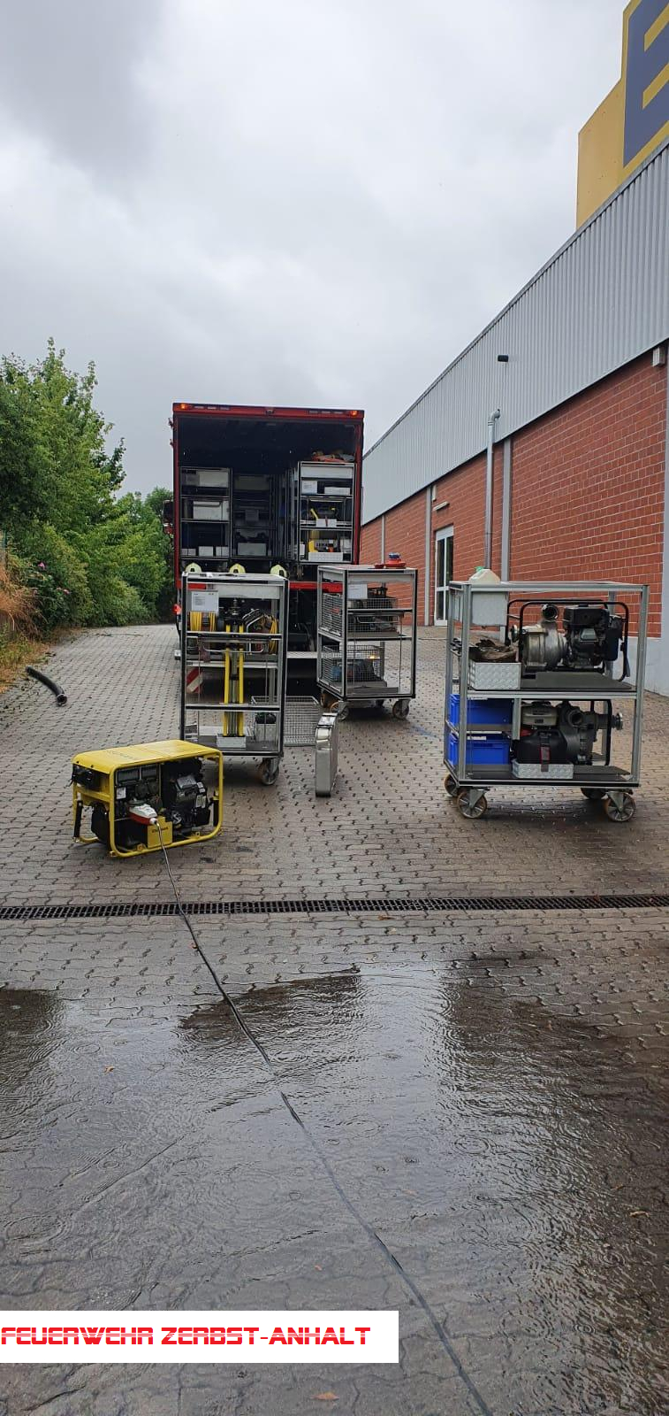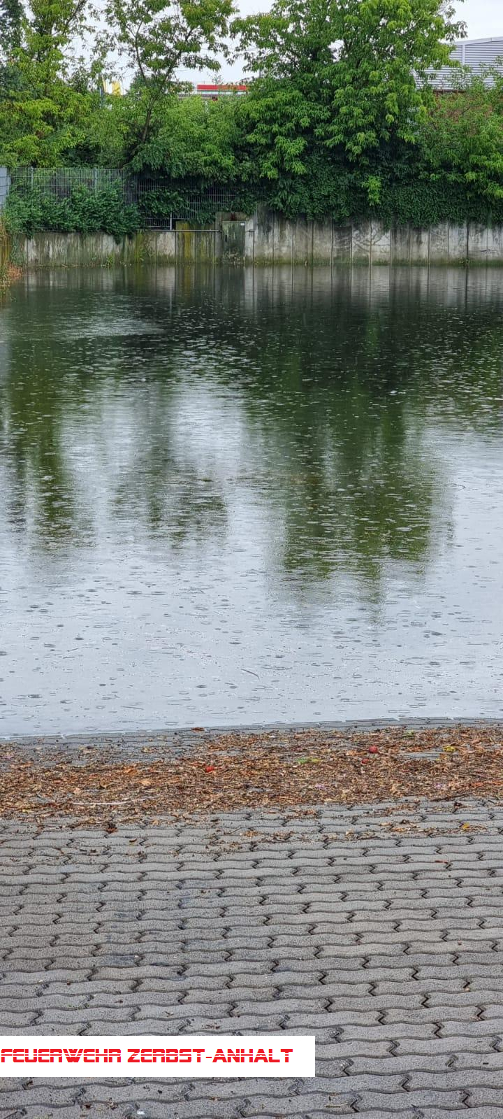 Wir wurden zu einem Supermarkt in der Coswiger Straße gerufen. Dort stand die gesamte Liefereinfahrt unter Wasser, da die vorhandenen Pumpstationen die Wassermassen nicht bewältigen konnten.