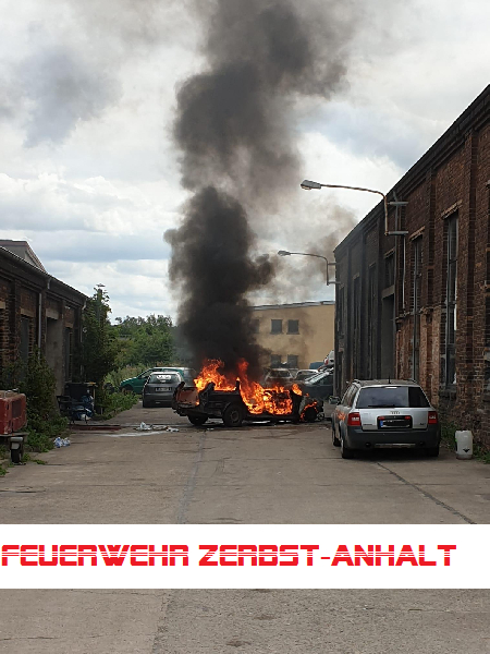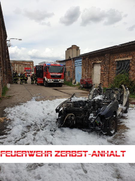 Dort fanden wir dann jedoch einen brennenden PKW vor, der augenscheinlich verschrottet werden sollte. Anwesende Personen hatten das Fahrzeug noch ins Freie schieben können und erste Löschversuche unternommen.