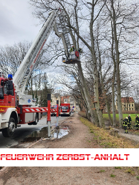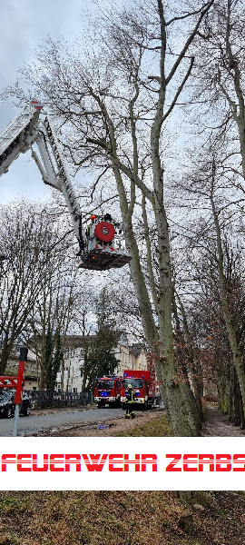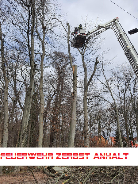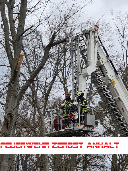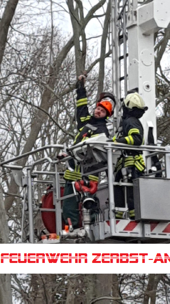 Der Baum wurde zunächst mit dem Greifzug gesichert. Nachdem mit Hilfe der Polizei zwei PKW-Halter ermittelt und informiert wurden, um ihre Fahrzeuge in Sicherheit zu bringen, wurde der Baum mit der Kettensäge vom Hubsteiger aus abgetragen.