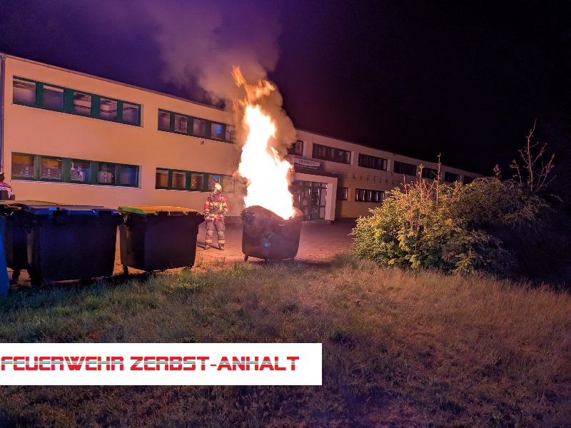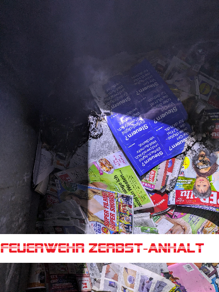 Kurz nachdem wir vom vorhergehenden Einsatz zur Wache zurückgekehrt waren, erreichte uns eine erneute Alarmierung. Jetzt brannte an der Einfahrt zum Parkplatz an der Kita in der Bäckerstraße ein Müllcontainer. Der oder die Täter hatten zudem versucht, einen Papiercontainer in Brand zu setzen, dort hatte sich dann ein Schwelbrand entwickelt.