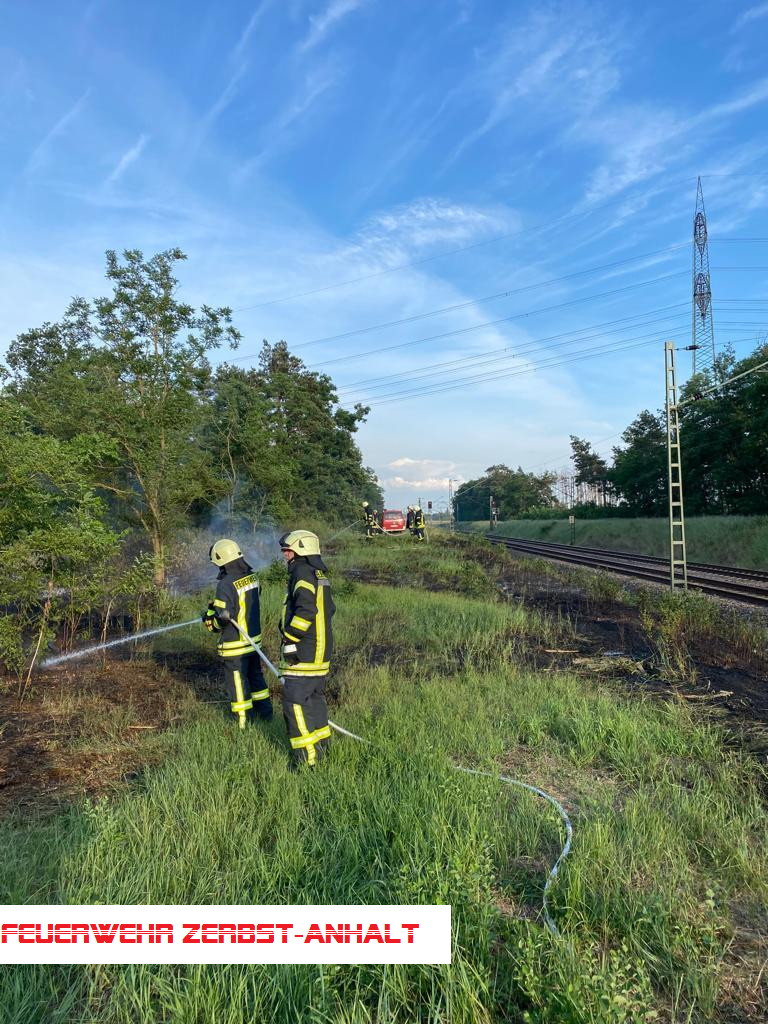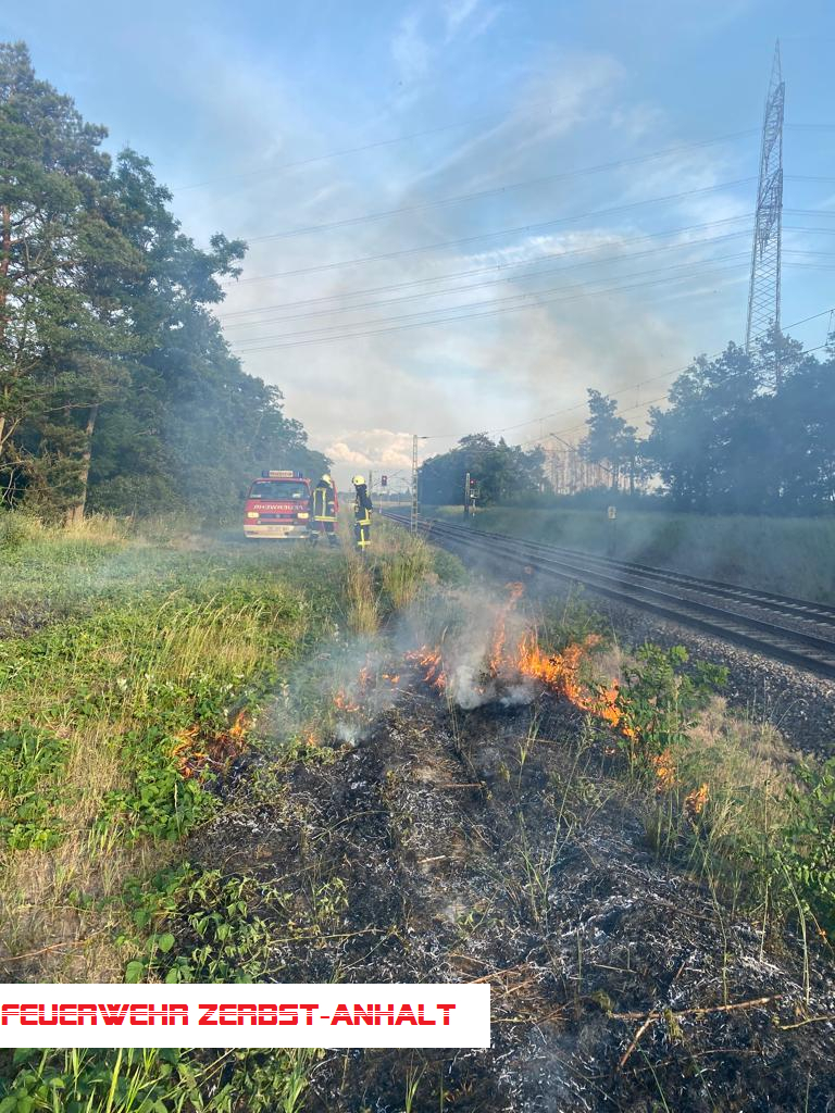 Vor Ort fanden wir mehrere 100 qm brennendes Ödland vor, das Feuer hatte bereits auf die Böschung an den Bahngleisen übergegriffen und drohte, in den Wald zu laufen.
