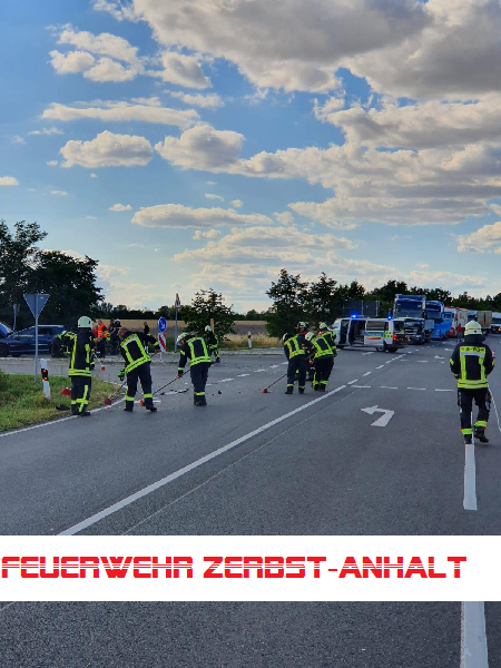 Wir wurden zu einem Verkehrsunfall alarmiert. Auf der B 184 in Höhe des Abzweiges nach Moritz war es zu einem Unfall zwischen einem PKW und einem Motorrad gekommen. Das Motorrad rutschte dabei in den Straßengraben und geriet in Brand. Das Feuer breitete sich auf die Böschung aus.