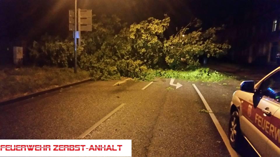 Durch das Unwetter mit lang anhaltenden Starkregen, Gewitter und Sturm wurde ein Baum entwurzelt und stürzte über die Fahrbahn, welche dadurch blockiert war.