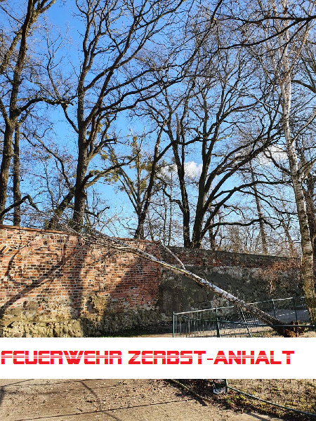 Erneut wurden wir wegen eines umgestürzten Baumes alarmiert. Dieser lag in der Zufahrt zu mehreren Wohnhäusern auf der Stadtmauer und hatte sich dabei in der Stromleitung für die Straßenbeleuchtung verfangen.