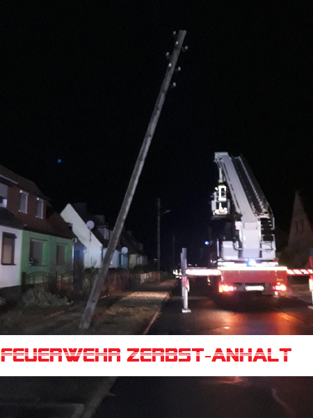 Wir wurden in die Straße "Springberg" gerufen. Dort drohte ein Holzmast der Straßenbeleuchtung auf die Straße zu fallen. Der Mast wurde nur noch durch die Freileitung gehalten.