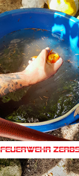 Wir haben das Wasser mit zwei Tauchpumpen abgepumpt. Dabei fanden wir im Keller auch zwei Goldfische, die wir zunächst in eine Wanne setzten. Wir waren schon ein wenig erstaunt, als die Leiterin uns informierte, dass die Einrichtung gar keinen Teich und keine Goldfische besitzt. Sie wollte sich am nächsten Tag in der Nachbarschaft erkundigen, wo die Goldfische "entlaufen" sein könnten.