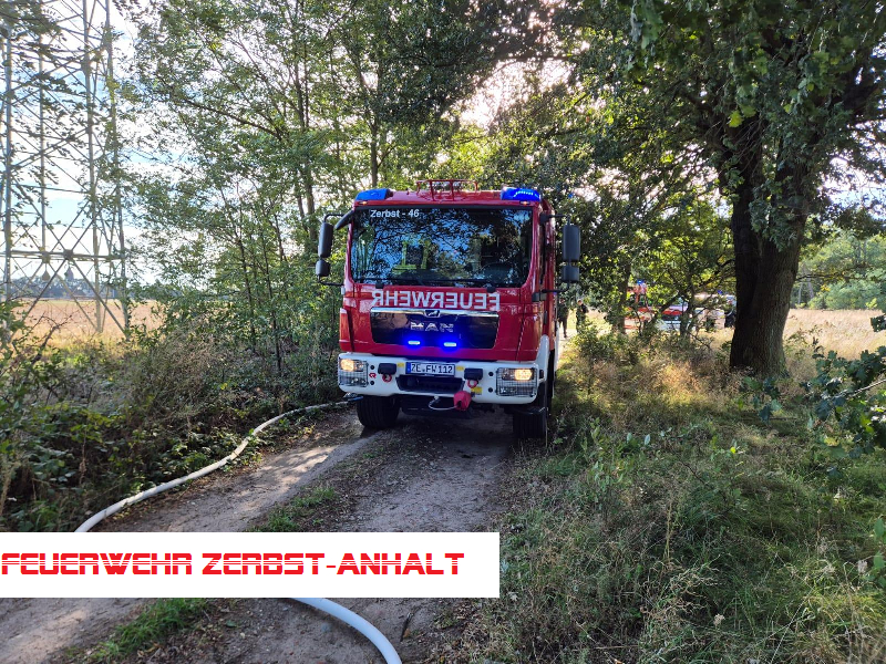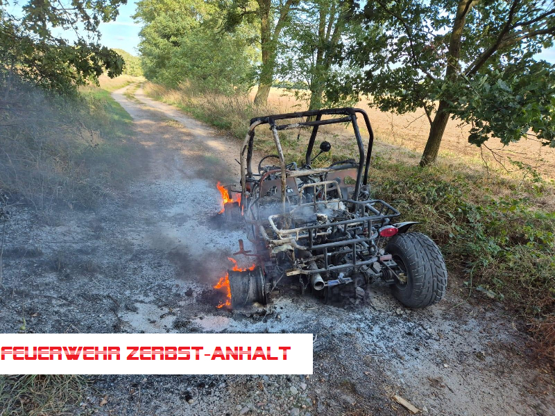 Noch an der Einsatzstelle vom vorhergehenden Ödlandbrand wurden wir zu einem Fahrzeugbrand zwischen Zerbst und Bias alarmiert. Hier fanden wir an einem Feldweg ein inzwischen fast vollständig ausgebranntes Quad vor. Wir haben mit dem C-Strahlrohr eine Restablöschung vorgenommen.