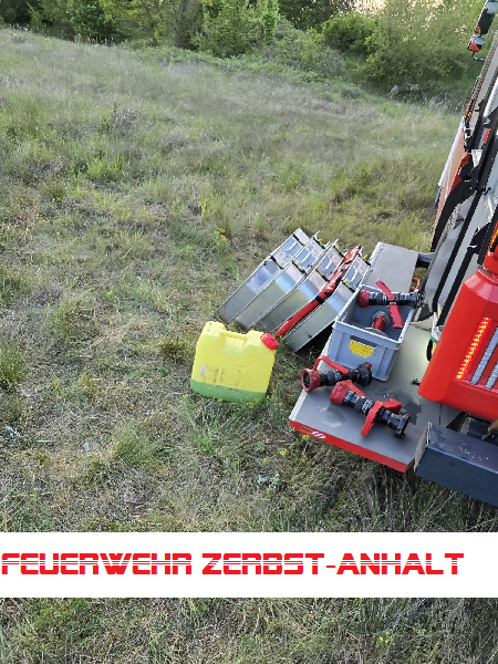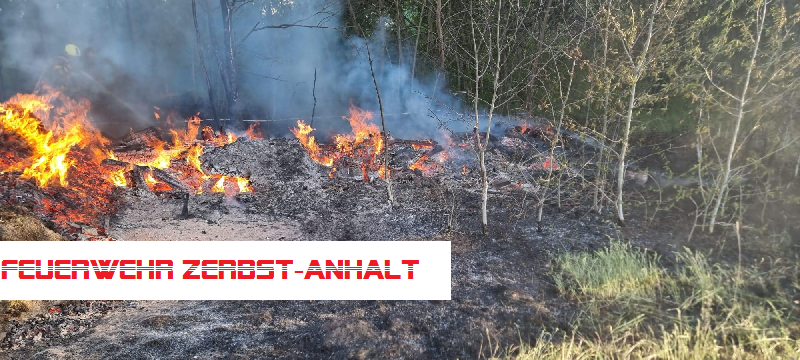 Hier fanden wir in unwegsamen Gelände einen brennenden Holz- und Unrathaufen vor; das Feuer breitete sich über trockenes Gras und Gebüsch weiter aus. Nach einer ersten Lageerkundung haben wir die Fahrzeuge noch einmal über den Ahornweg umgesetzt, um näher an die Brandstelle zu kommen. Zudem wurde die Freiwillige Feuerwehr Jütrichau nachalarmiert.