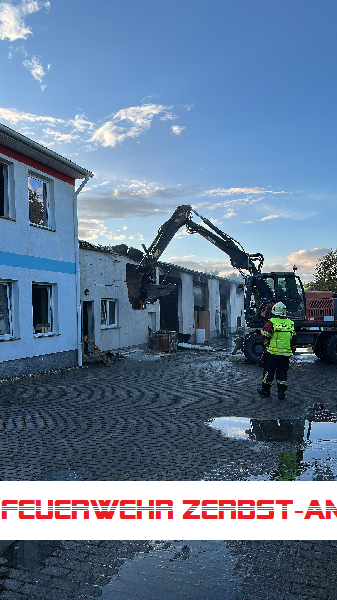 Da wir wegen der zwischenzeitlich herrschenden Einsturzgefahr insbesondere die Brandherde auf den Zwischenböden nicht mehr erreichen konnten und auch die im Dach verbauten Sandwichplatten teilweise Feuer gefangen hatten, entschied die Einsatzleitung, das Dach der Halle an mehreren Stellen mit einem Bagger zu öffnen. Hier unterstützte uns die Firma ZETIEBA. Im Anschluss konnten sowohl vom Hubsteiger als auch vom Boden die letzten Brandherde gelöscht werden. Stellen mit einer besonders hohen Brandlast haben wir im Anschluss mit Schaum abgedeckt.