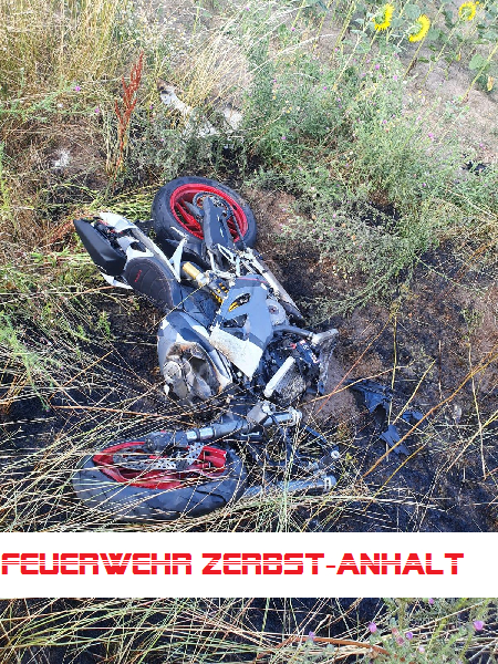 Wir wurden zu einem Verkehrsunfall alarmiert. Auf der B 184 in Höhe des Abzweiges nach Moritz war es zu einem Unfall zwischen einem PKW und einem Motorrad gekommen. Das Motorrad rutschte dabei in den Straßengraben und geriet in Brand. Das Feuer breitete sich auf die Böschung aus.